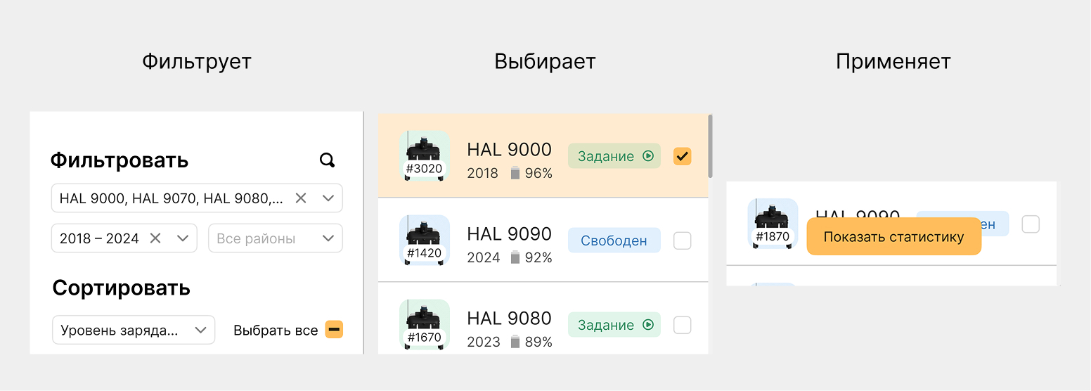 Это позволяет быстро сфокусироваться либо на определённой группе машин, либо перейти к статистике конкретного робота (к этому сценарию я вернусь позже).